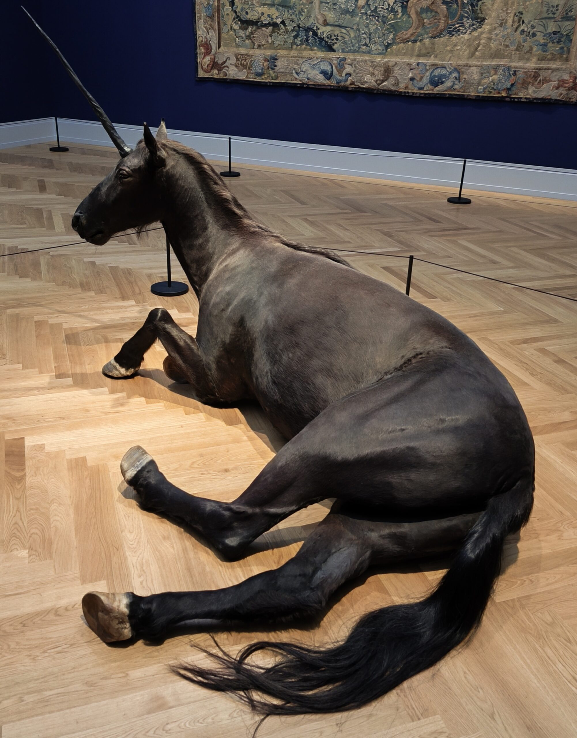 Der Aufbau der Ausstellung war genial strukturiert und in unterschiedliche Themenbereiche aufgeteilt. In dieser Ausstellung findet man mehr als 140 Werke aus 80 internationalen Sammlungen. Darunter Werke aus Museen in London, Madrid, New York und aus dem Louvre in Paris. Eindrucksvolle Exponate zeigten, wie das Narwalhorn – das vermeintliche Horn des Einhorns – über Jahrhunderte als Wundermittel und Statussymbol in fürstlichen Schatzkammern aufbewahrt wurde. Es war faszinierend zu sehen, wie ein real existierendes Tier die Grundlage für eine der mächtigsten Legenden der Menschheitsgeschichte bildete. Der Übergang von der zoologischen Verwechslung zur tief religiösen und künstlerischen Bedeutung war fließend. Im Herzen der Ausstellung entfaltete sich das Einhorn als Symbol der Reinheit, der Keuschheit und der göttlichen Macht. Eindrucksvolle mittelalterliche Tapisserien, wie man sie sonst nur selten außerhalb großer Sammlungen sieht, zogen mich in ihren Bann. Die Detailverliebtheit, mit der die Jäger das Fabeltier umzingeln oder es sanft in den Schoß einer Jungfrau legen, zeugte von der tiefen Verankerung des Mythos im Glauben der damaligen Zeit. Besonders spannend fand ich die Darstellung des Einhorns in der Renaissance. Es wurde zunehmend säkularisiert, fand Einzug in Wappen und allegorische Darstellungen und spiegelte den intellektuellen Wandel dieser Epoche wider.